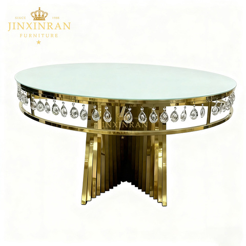 Mesa de boda de cristal de lujo moderna, marco dorado de acero inoxidable, mesas de boda de cristal redondas para eventos