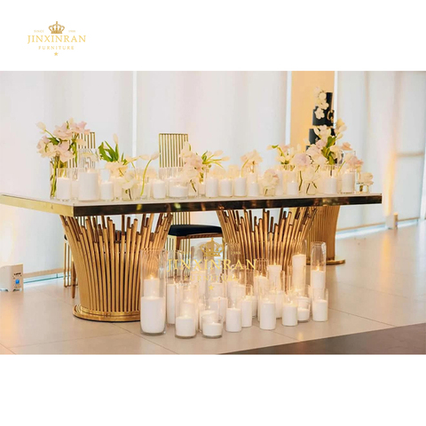 Mesa de boda de lujo moderna, marco de acero inoxidable dorado, mesa de serpentina para eventos superiores de MDF para hoteles de boda