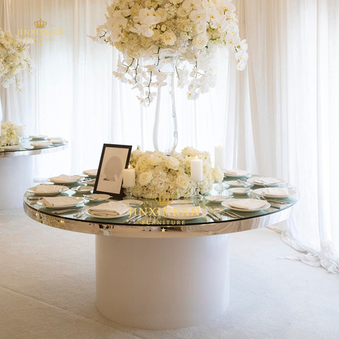 Mesa de boda de oro de acero inoxidable de lujo moderno espejo redondo mesa de hotel superior de vidrio templado para eventos