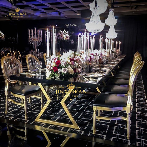 Mesa de boda con espejo de cristal con marco de acero inoxidable dorado de lujo moderno, mesa de evento rectangular larga para Hotel