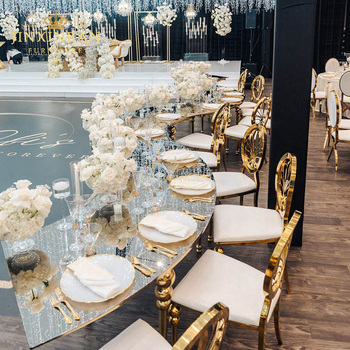 โต๊ะจัดเลี้ยงในงานอีเวนต์สุดหรูของโรงแรมโต๊ะสแตนเลสสีทองกรอบกระจกด้านบนโต๊ะแต่งงานแบบคดเคี้ยว